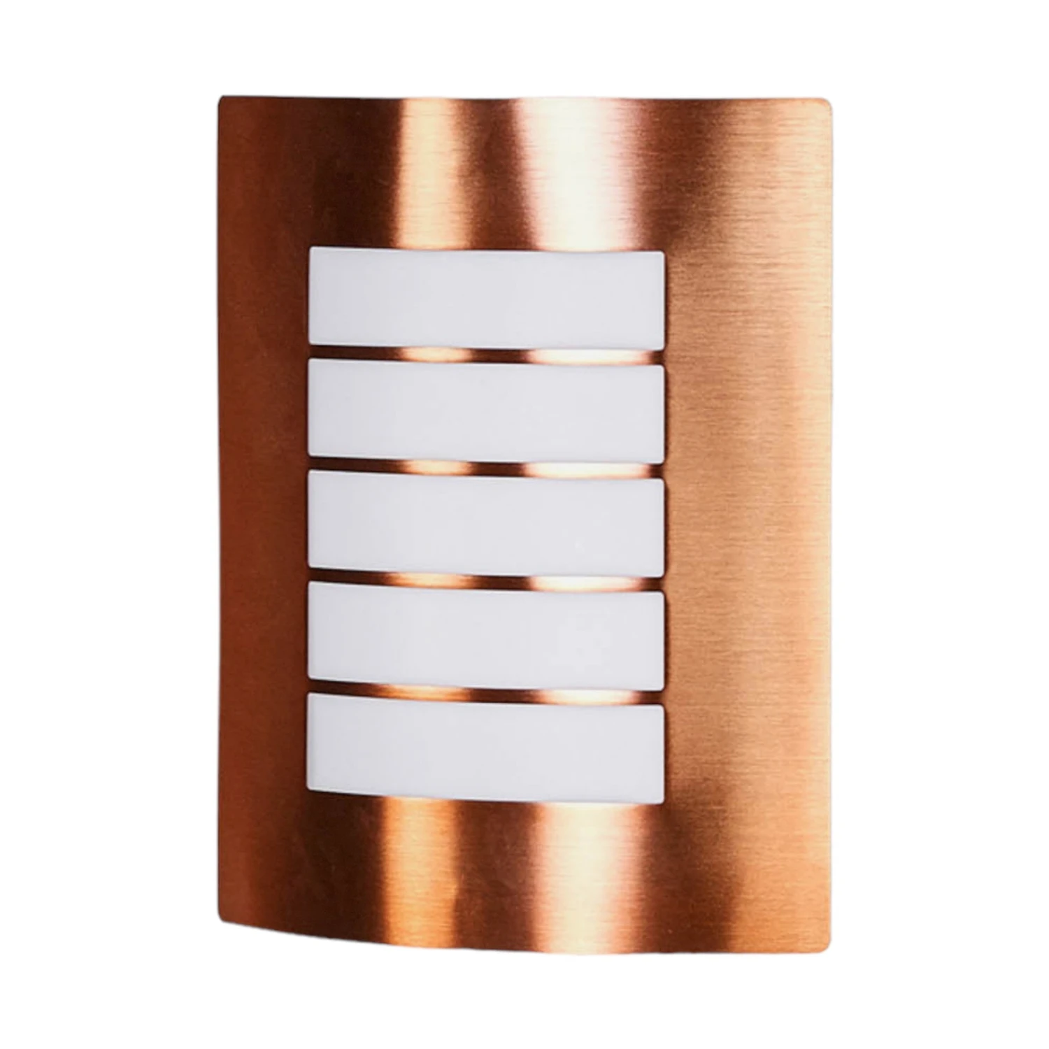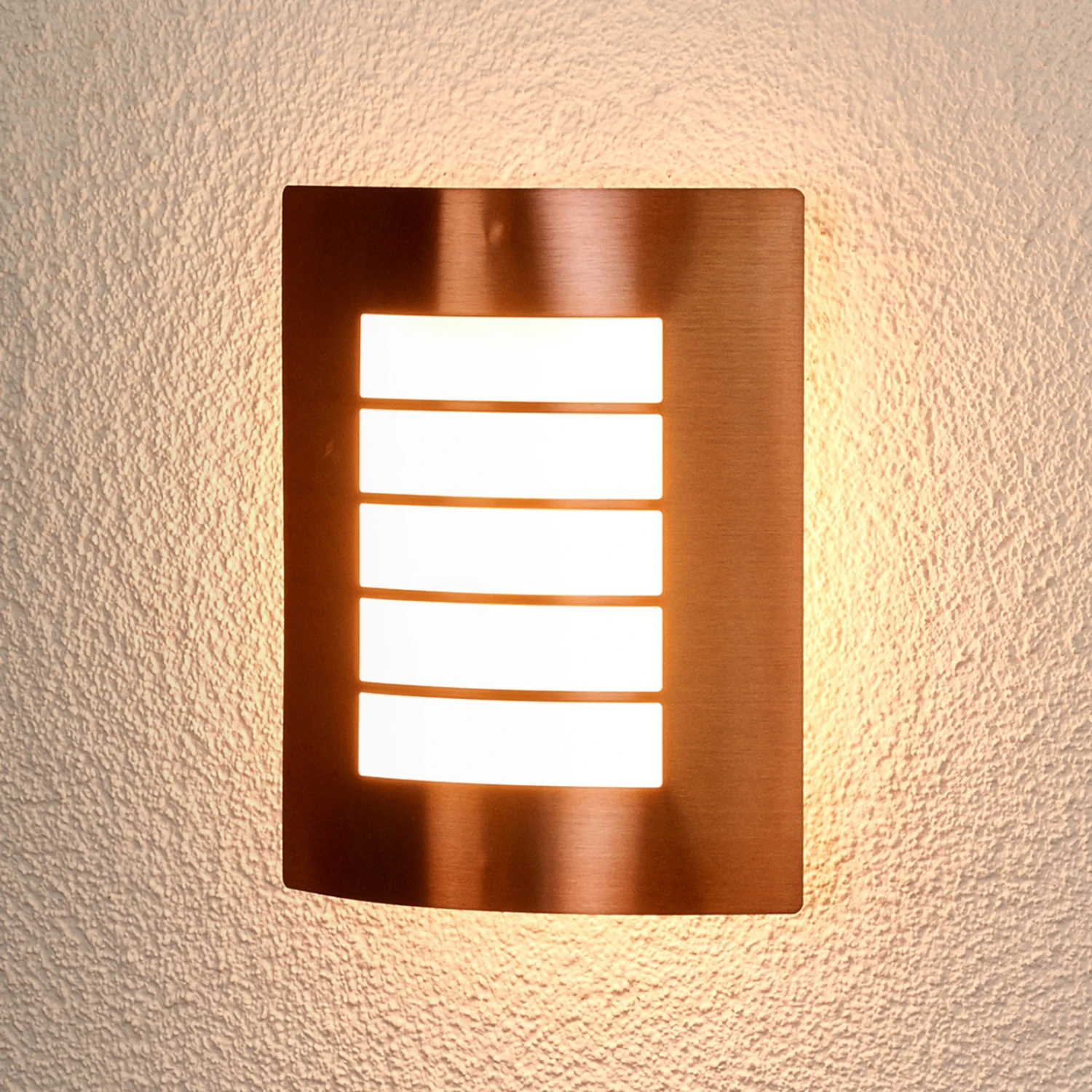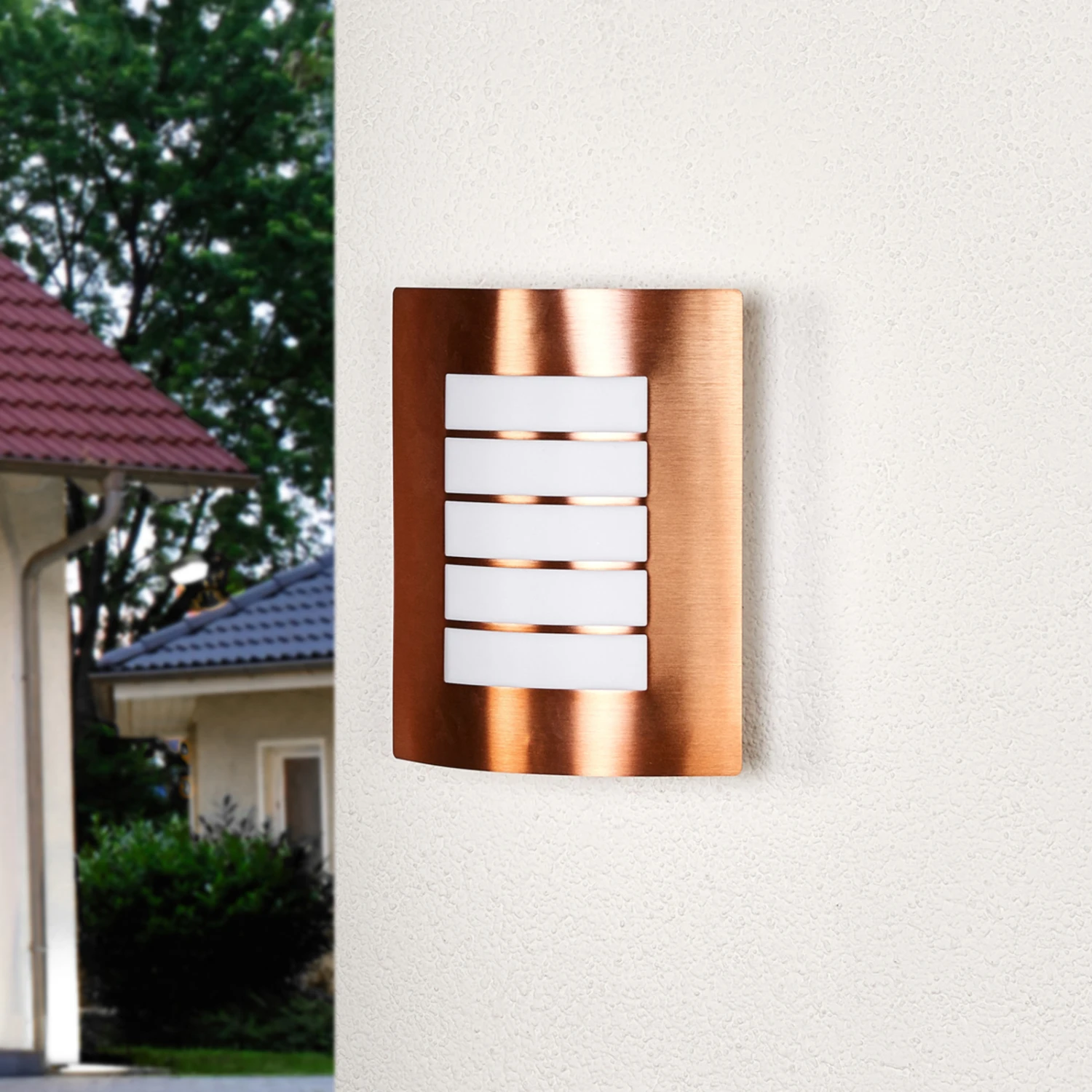 Cela fait bien longtemps que les surfaces de couleur cuivre jouissent d’une grande popularité, et les appliques pour l’extérieur qui possèdent cette nuance se démarquent souvent de ce que l’on a l’habitude de voir. La structure de l’applique pour l’extérieur Blanka est revêtue d’une peinture de coloris cuivre, et elle est doucement courbe, alors que sa forme de base, quand on regarde cette lampe de face, est rectangulaire et c’est pourquoi elle se combine particulièrement bien à une architecture contemporaine. L’écran intérieur situé au milieu du cadre de couleur cuivre est en polycarbonate blanc, dont la surface est interrompue visuellement par quatre bandes de métal.
