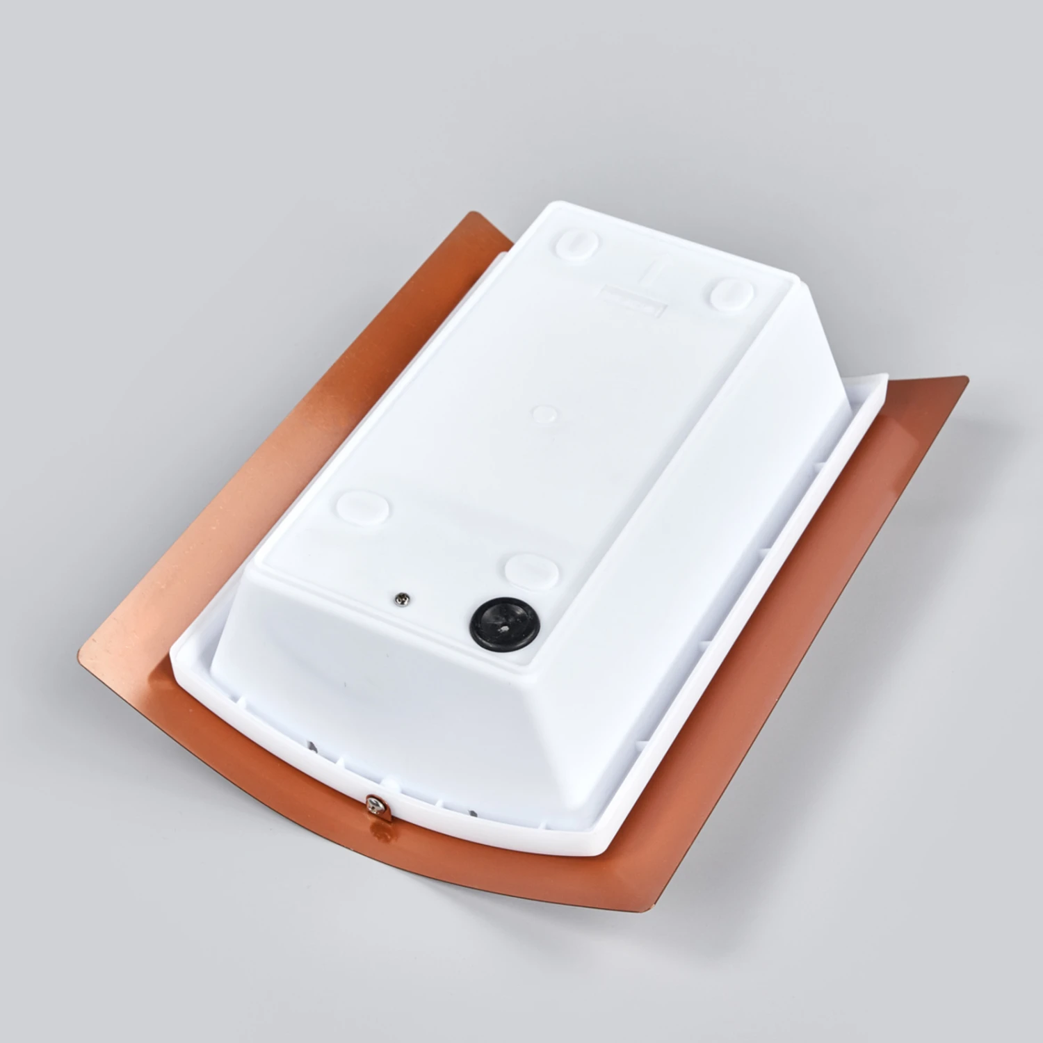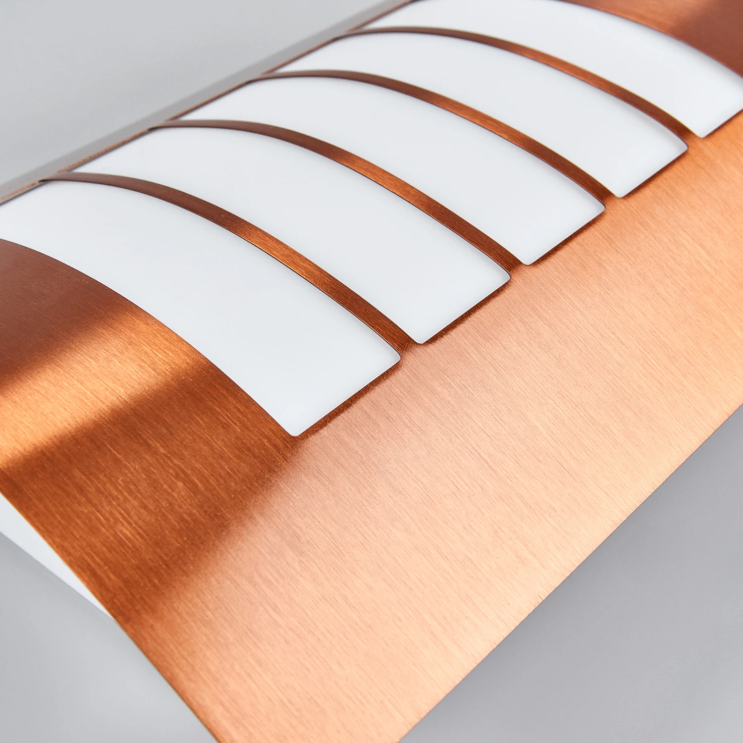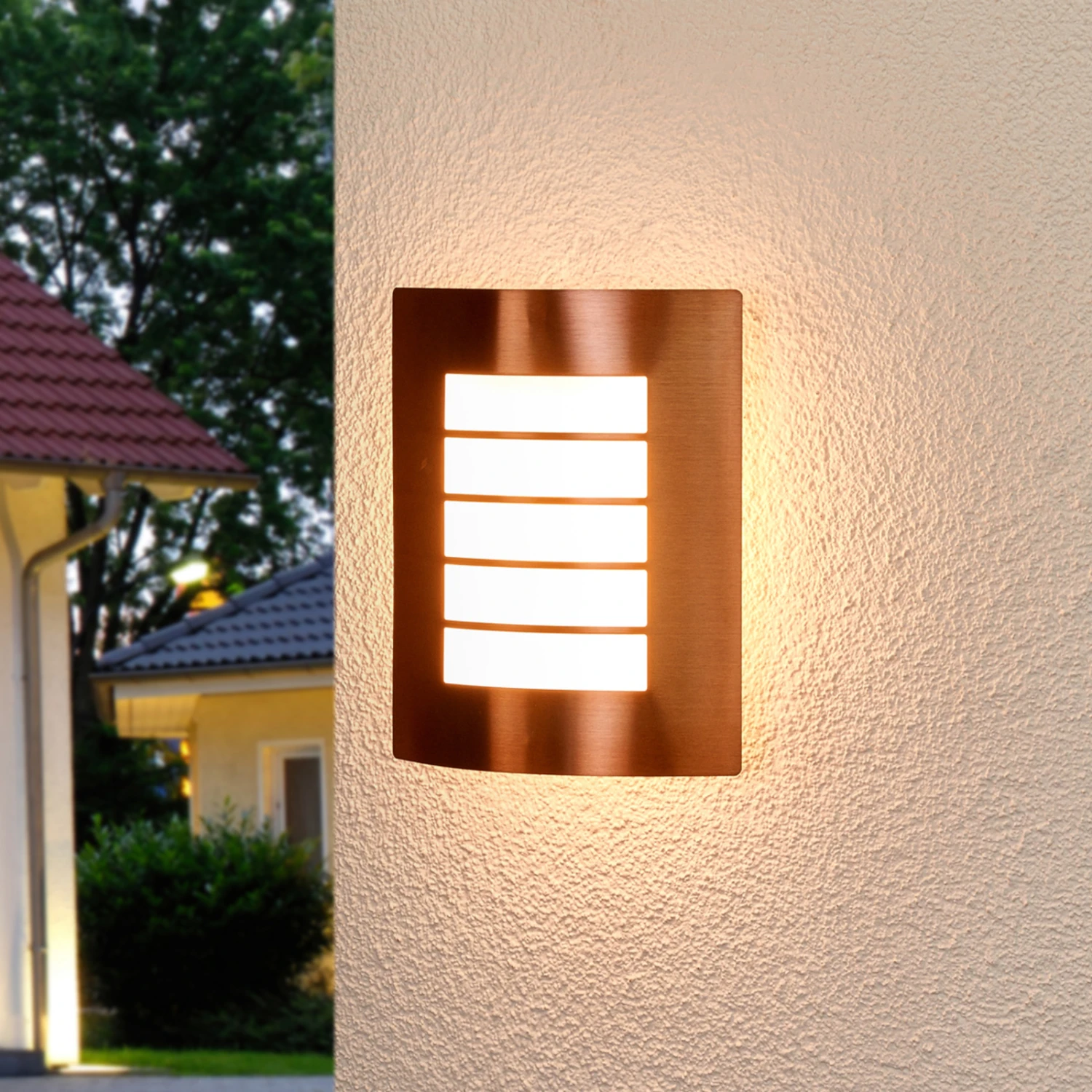 Cela fait bien longtemps que les surfaces de couleur cuivre jouissent d’une grande popularité, et les appliques pour l’extérieur qui possèdent cette nuance se démarquent souvent de ce que l’on a l’habitude de voir. La structure de l’applique pour l’extérieur Blanka est revêtue d’une peinture de coloris cuivre, et elle est doucement courbe, alors que sa forme de base, quand on regarde cette lampe de face, est rectangulaire et c’est pourquoi elle se combine particulièrement bien à une architecture contemporaine. L’écran intérieur situé au milieu du cadre de couleur cuivre est en polycarbonate blanc, dont la surface est interrompue visuellement par quatre bandes de métal.