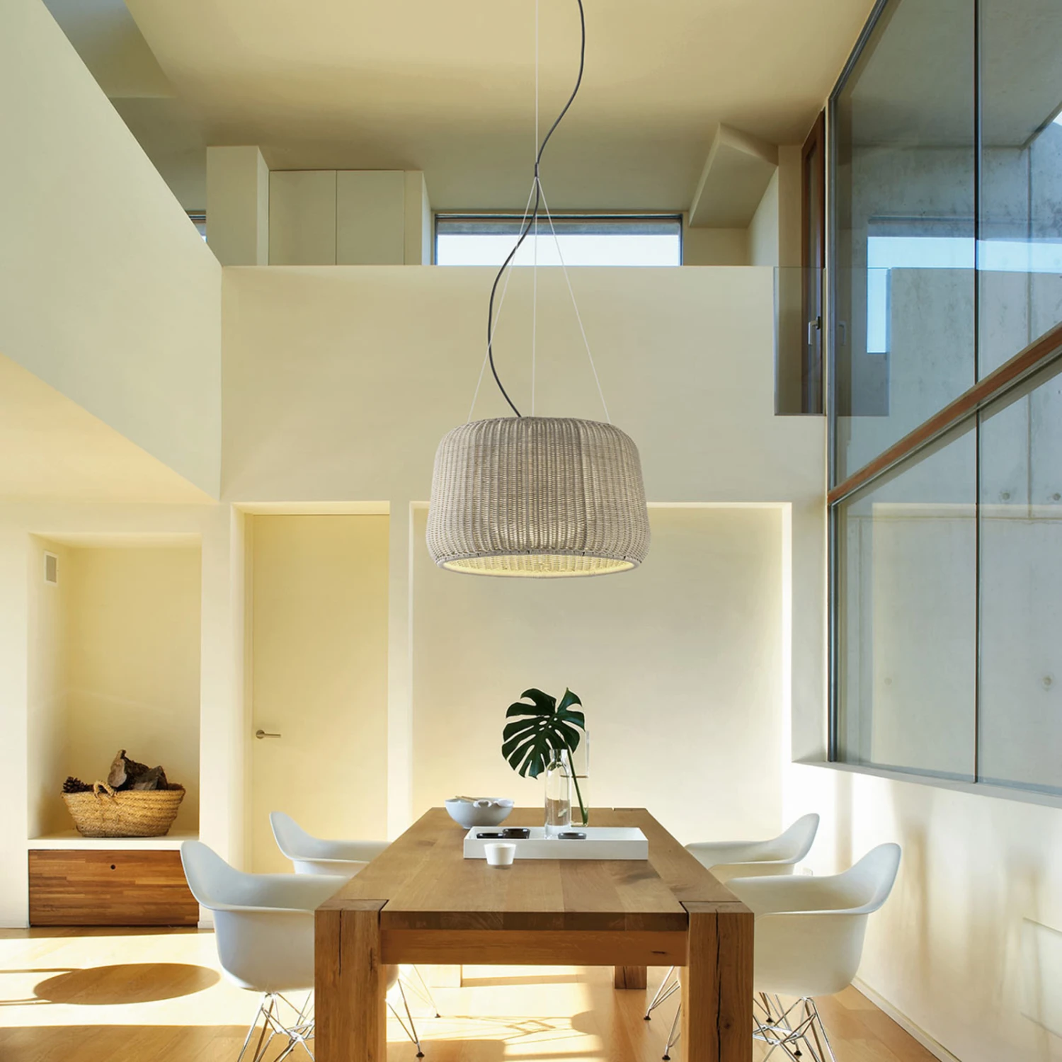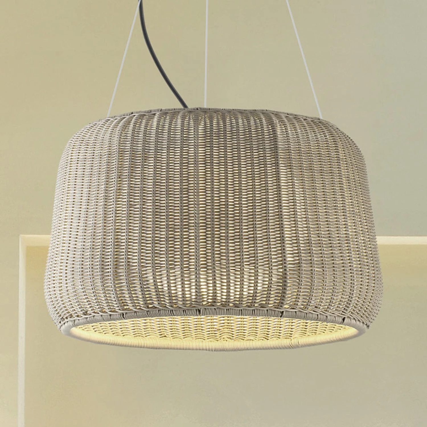 L’abat-jour de cette magnifique suspension d’extérieur qui résiste aux intempéries grâce au matériau synthétique tressé dont il est composé a été soigneusement fabriqué à la main. Cette lampe apporte de l’élégance et du charme aux espaces extérieurs privés, mais aussi surtout aux espaces professionnels comme les cafés, les restaurants, etc. Ä. Lorsque la lampe est éteinte, son très beau design crée déjà une ambiance méditerranéenne dont l’effet est encore renforcé lorsque l’ellipse en polyéthylène qui se trouve à l’intérieur s’allume. En effet, l’abat-jour intérieur n’accueille pas seulement l’ampoule, il assure également un éclairage sans éblouissement dans toutes les directions.