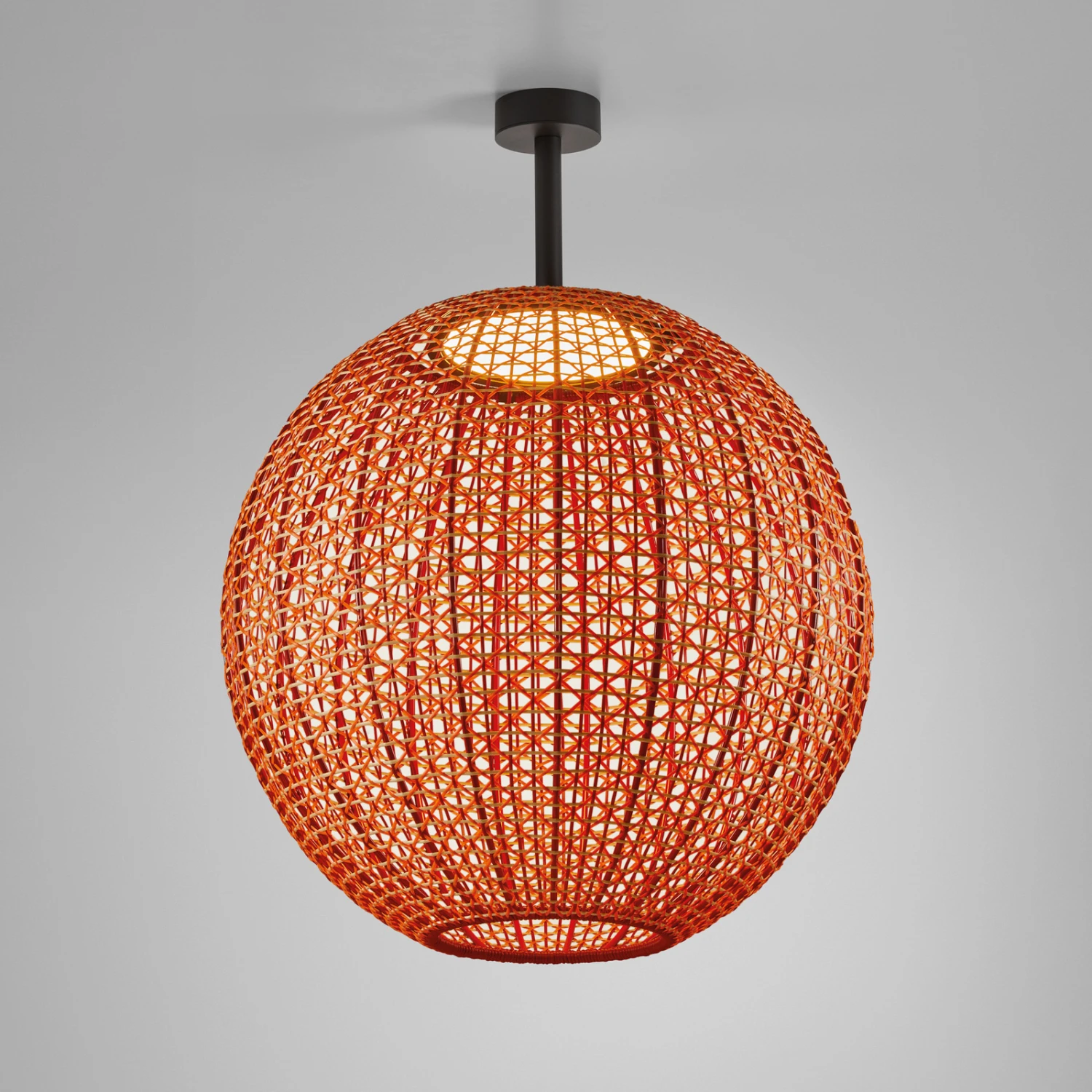 Plafonnier d’extérieur design Nans Sphere PF avec abat-jour tresséL’entreprise de design Bover, basée à Barcelone, incarne le style de vie méditerranéen avec ses produits Made in Spain. Le plafonnier Nans Sphere est conçu pour l’extérieur, mais peut également être utilisé à l’intérieur. L’abat-jour sphérique est tressé à partir d’une fibre synthétique où des fils de différentes couleurs sont entrelacés. Le plafonnier est graduable par triac, le variateur n’est pas inclus.
