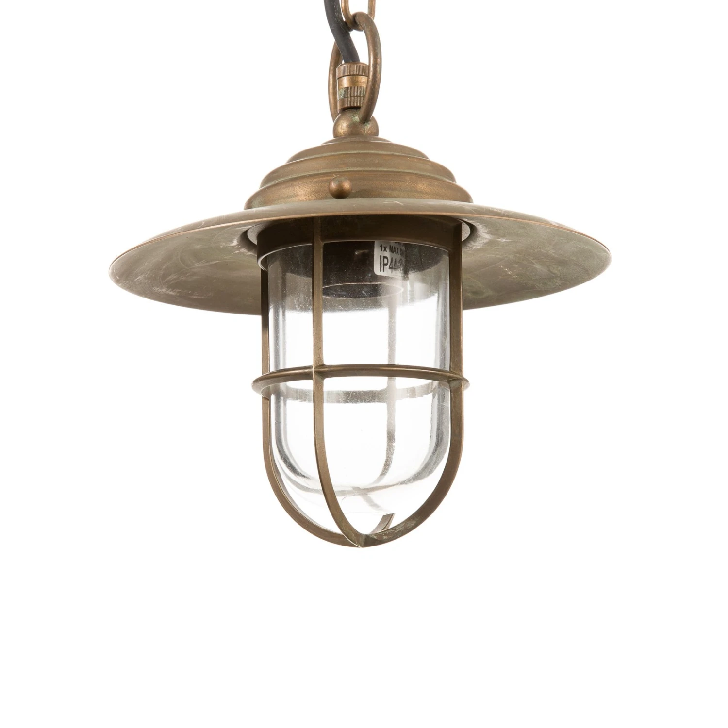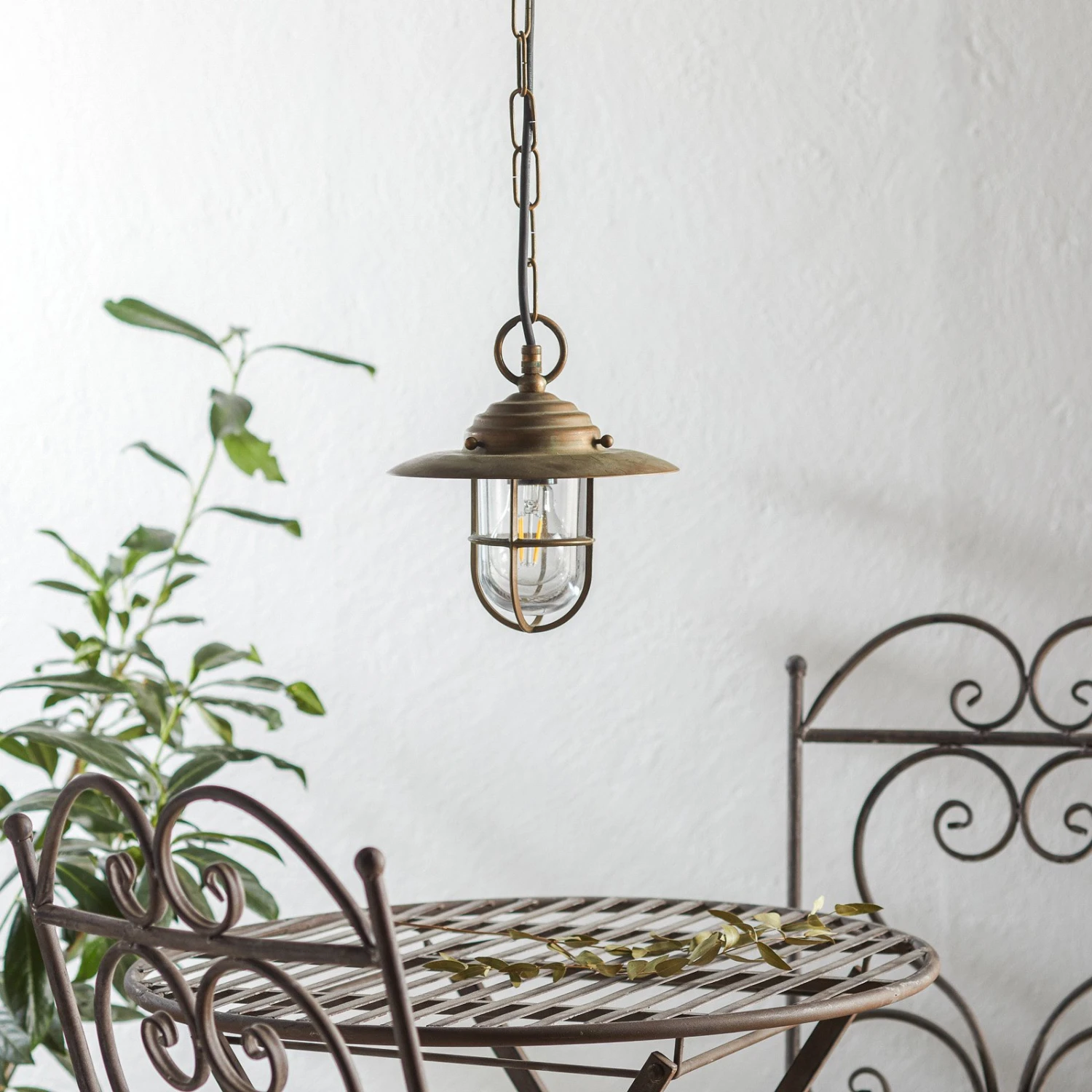 Lampe à suspendre Bruno en laiton d’aspect antiqueLa lampe à suspendre Bruno est conçue pour une utilisation en extérieur grâce à son indice de protection IP44, où elle assure un bon éclairage général sous les avancées de toit. Elle dispose d’un abat-jour en laiton largement évasé qui se balance sur une suspension à chaîne massive. Sous l’ampoule de protection se trouve une douille E27 dans laquelle l’ampoule est insérée. La corbeille en laiton confère à l’aspect une note particulièrement rustique, de sorte que le luminaire produit non seulement un magnifique effet lumineux, mais aussi un effet décoratif. Grâce à l’utilisation de laiton résistant à la corrosion, elle résiste en outre à l’eau de mer.