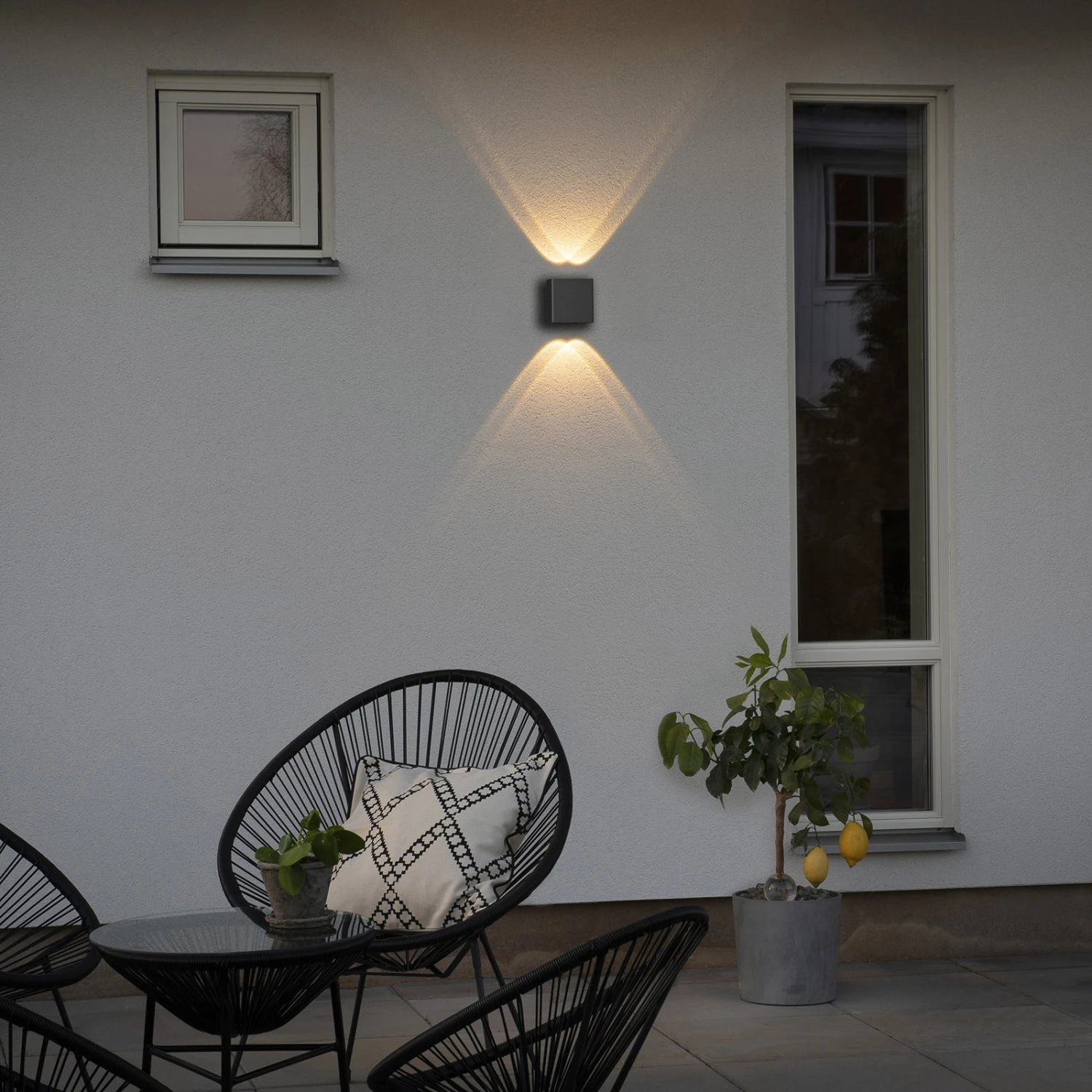 L’applique murale Chieri est conçue comme un parallélépipède simple et plat en aluminium avec un revêtement en poudre unicolore. L’accent est clairement mis sur l’effet d’éclairage : deux sources lumineuses LED distinctes sont intégrées sur les côtés étroits supérieur et inférieur, chacune dans une lentille en verre taillé convexe. Cela permet de créer des cônes lumineux bien définis qui se superposent aux sources lumineuses adjacentes, créant ainsi un effet attractif de haut en bas sur la façade.