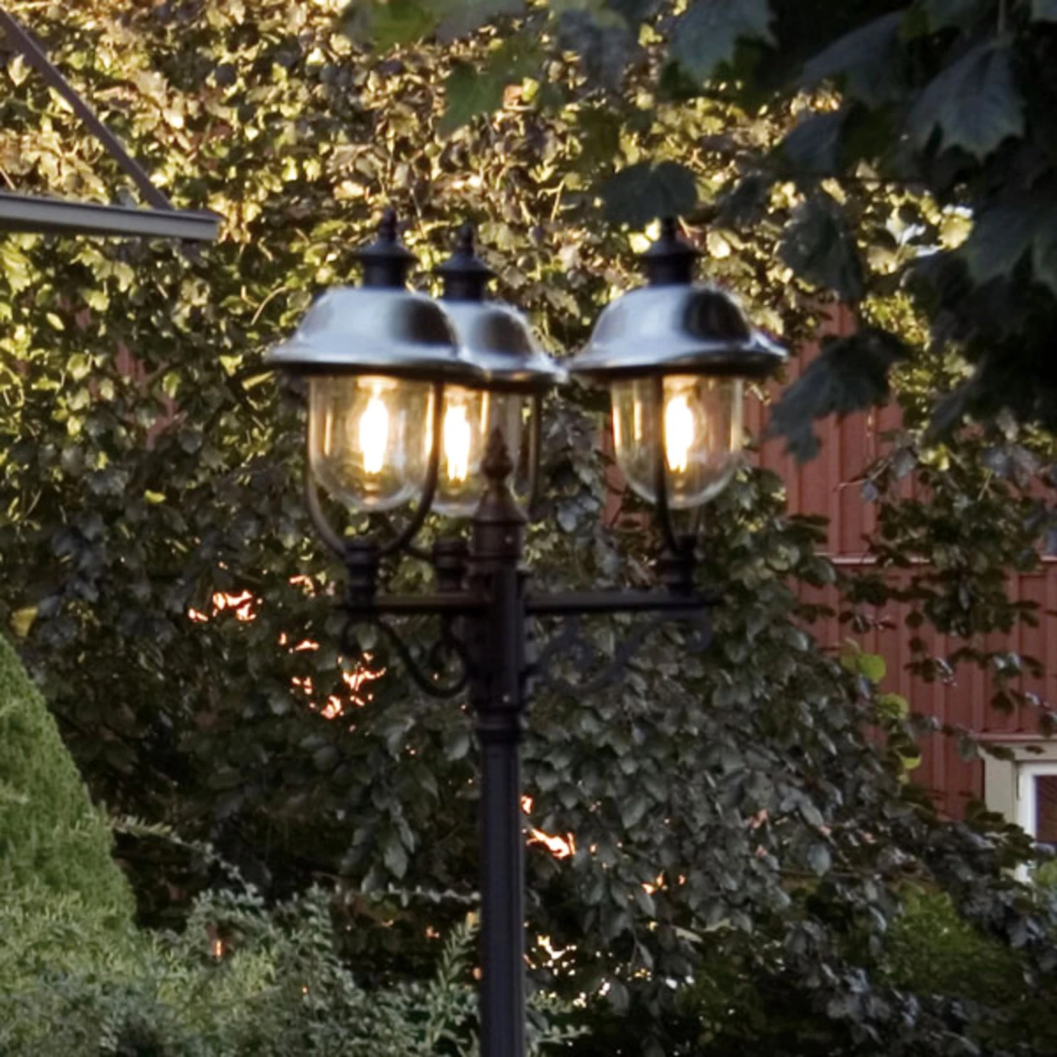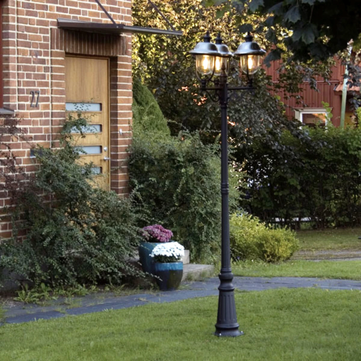 Le diffuseur en verre transparent de ce lampadaire garantit un éclairage optimal. Son design classique en noir est indémodable et est toujours élégant, quel que soit l’endroit où il se trouve. Les trois abat-jours sont disposés en triangle sur le poteau et disposent tous les trois d’une mini-toiture en inox, ce qui leur confère une esthétique particulière, du fait du contraste avec l’aluminium noir.