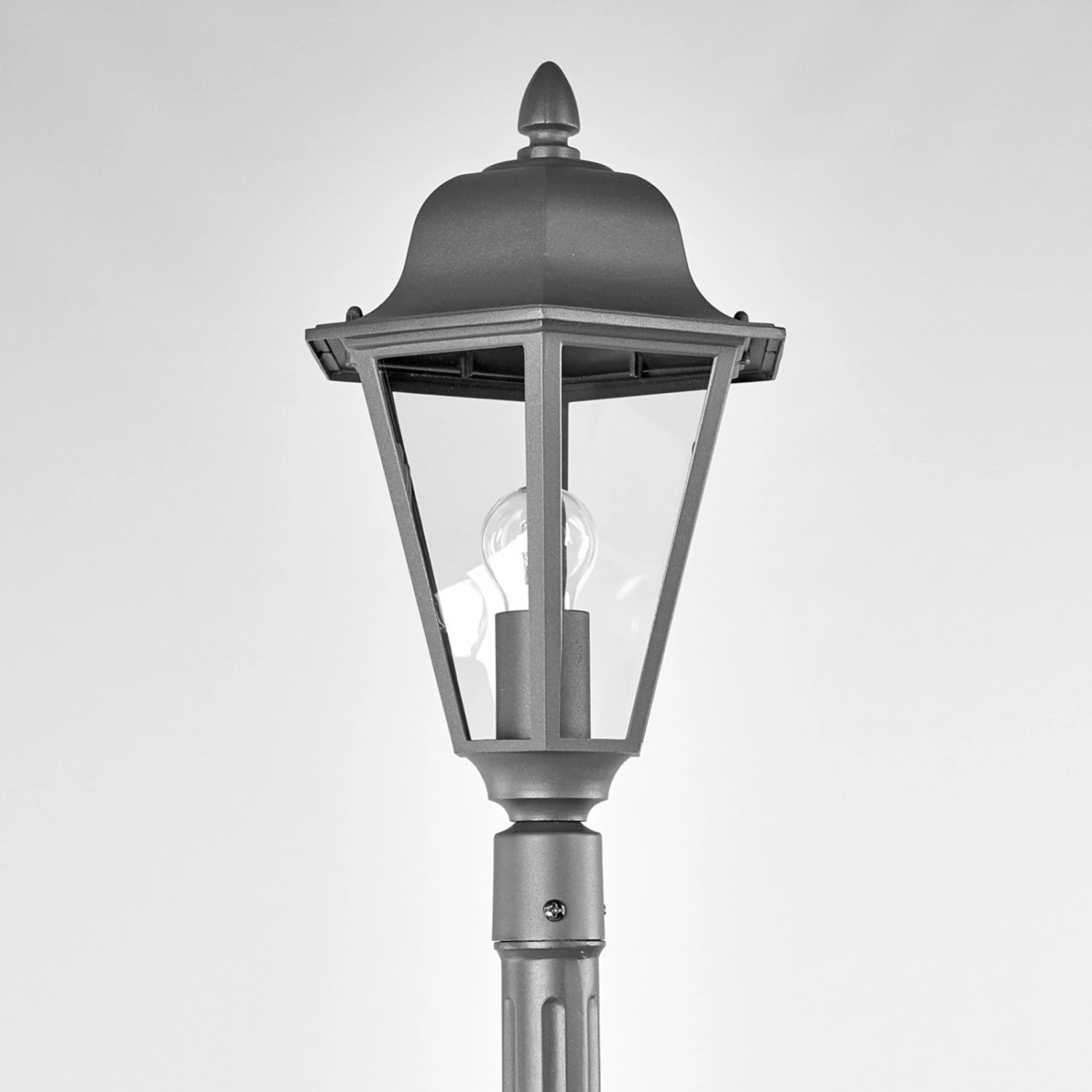 Ce lampadaire d’extérieur se présente sous une forme classique qui rappelle les lanternes d’autrefois. Le support métallique de l’abat-jour est doté d’un petit toit et tout autour sont disposées des vitres transparentes. L’ensemble est joliment décoré de petits détails. Le lampadaire d’extérieur Edana s’adapte à de nombreux environnements au charme classique et peut être équipé avec des ampoules pourvues d’un culot E27. Cela comprend non seulement des lampes à incandescence ou halogènes, mais aussi des lampes à économie d’énergie et des ampoules LED.