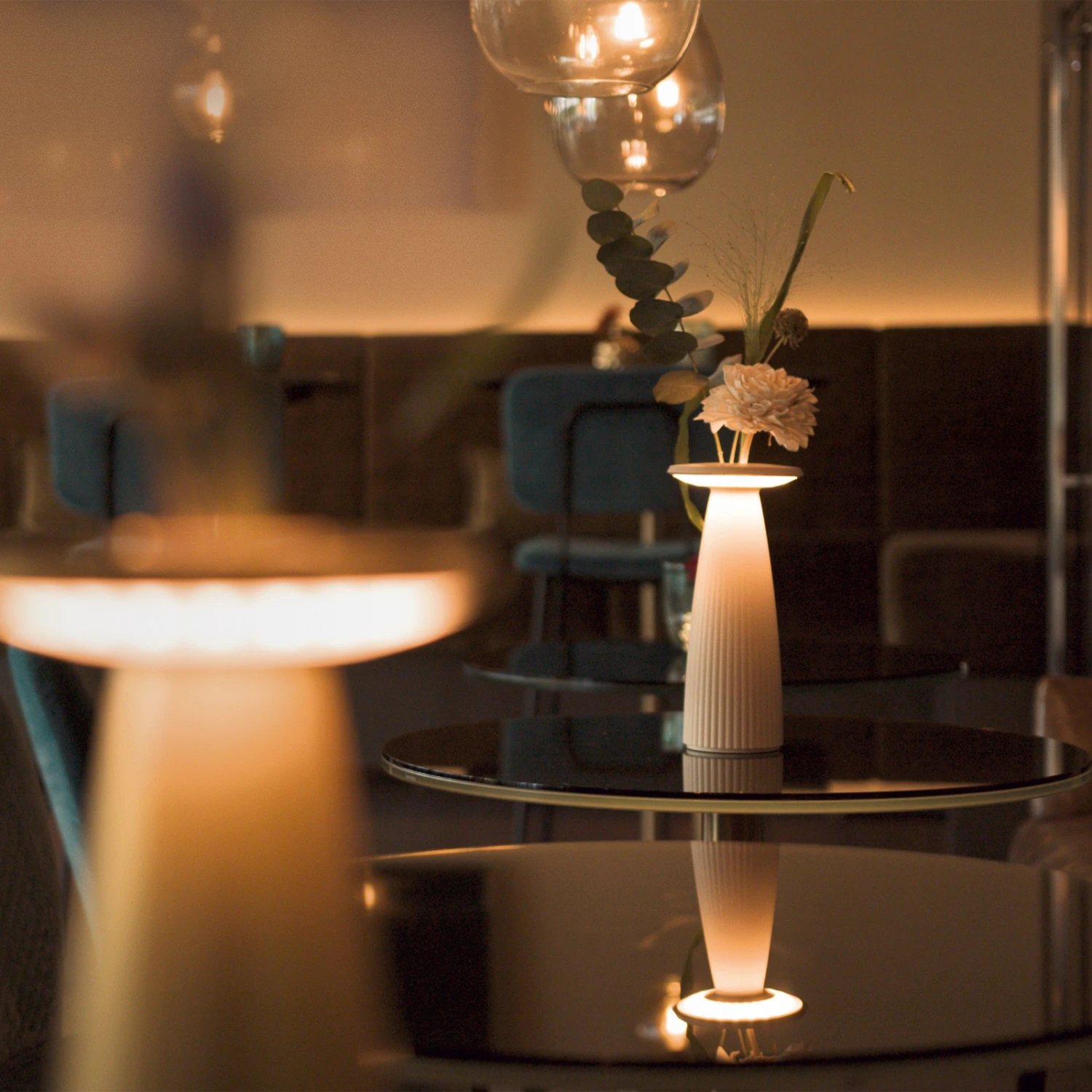 Lampe de table LED à accu Nuflair en aluminium pour l’extérieur En forme de vase avec un joli design, cette lampe de table à accu séduit en outre par ses fonctions modernes. La tête ronde et discrète est dotée d’un interrupteur tactile qui permet de régler facilement l’intensité lumineuse vers le bas ou vers le haut. De plus, grâce au Flex-Mood, il est possible de choisir entre deux couleurs de lumière en appuyant plusieurs fois sur le bouton. Grâce à la batterie intégrée, Nuflair est absolument flexible et mobile. Celui-ci permet une durée d’éclairage de 12 heures et peut ensuite être rechargé en toute simplicité en 6 heures environ grâce au câble magnétique fourni. L’insert pour vase, qui s’insère par le haut dans la lampe et peut même être rempli d’eau, est un atout supplémentaire. Il est ainsi possible d’intégrer à tout moment une fleur dans la lampe de table à accu pour la décorer. Nuflair est idéale pour les tables de restaurant, où elle peut également être utilisée à l’extérieur grâce à son indice IP54 – durée d’éclairage jusqu’à 12 heures à 100 % de puissance – durée de charge de 5 à 7 heures – couleur de lumière au choix entre 2.200 K et 2.700 K – intensité variable en continu
