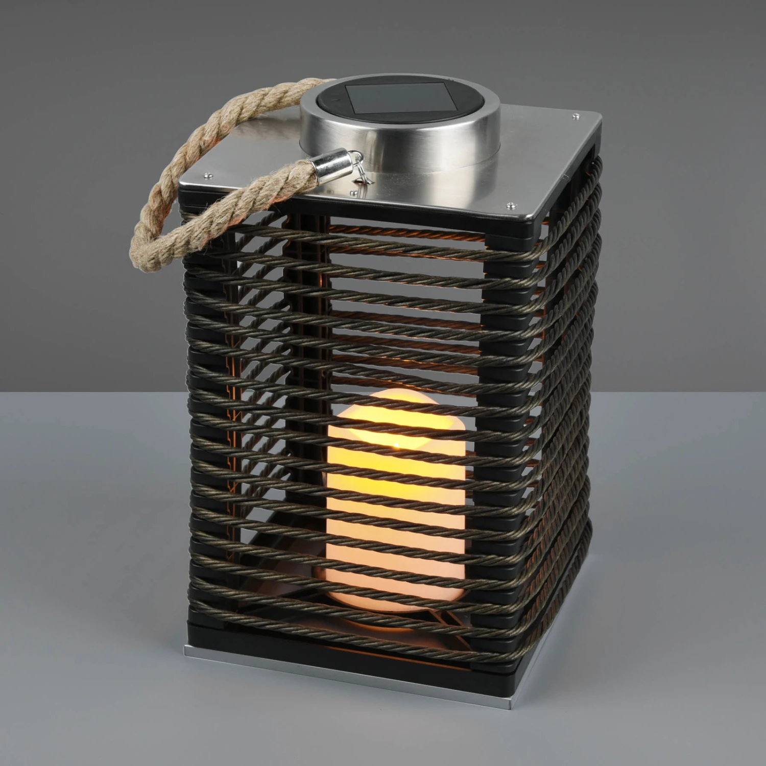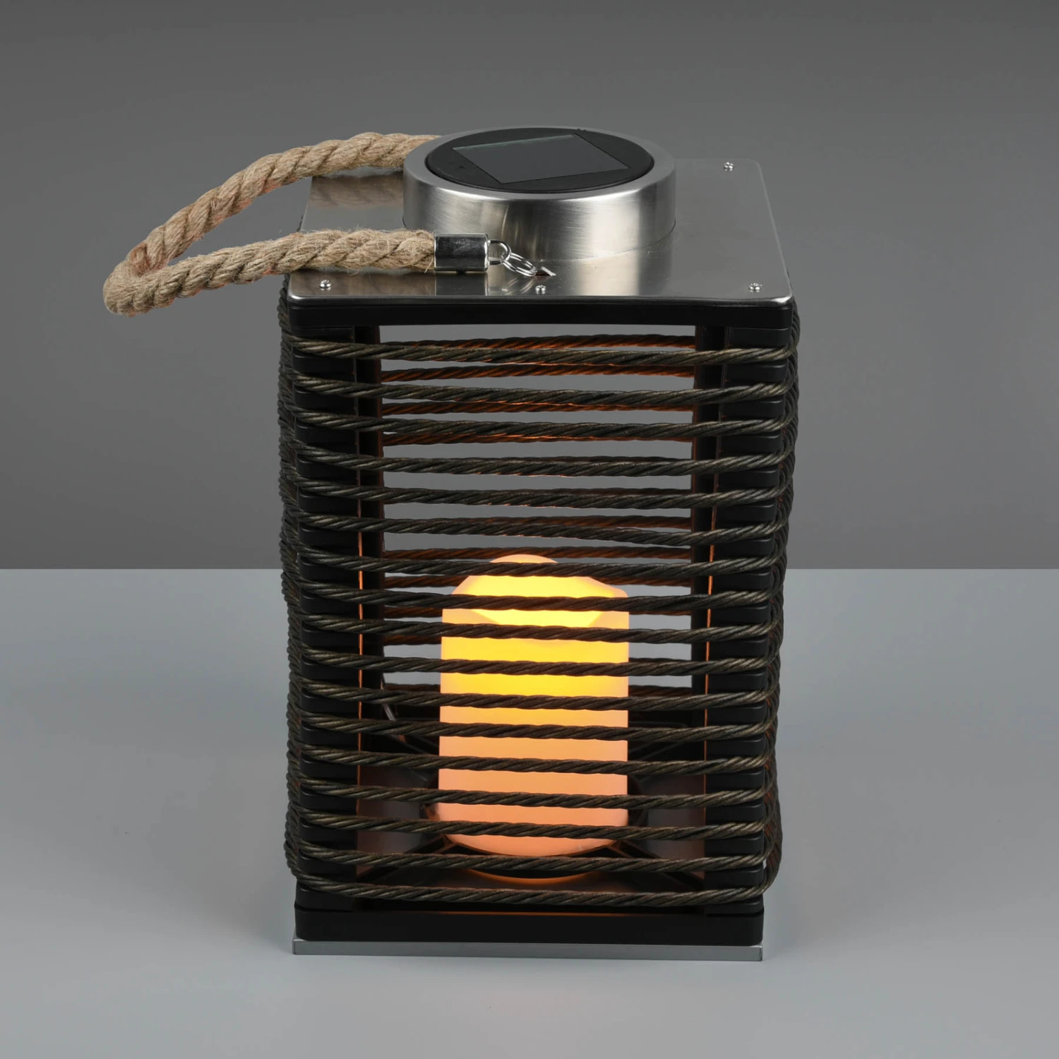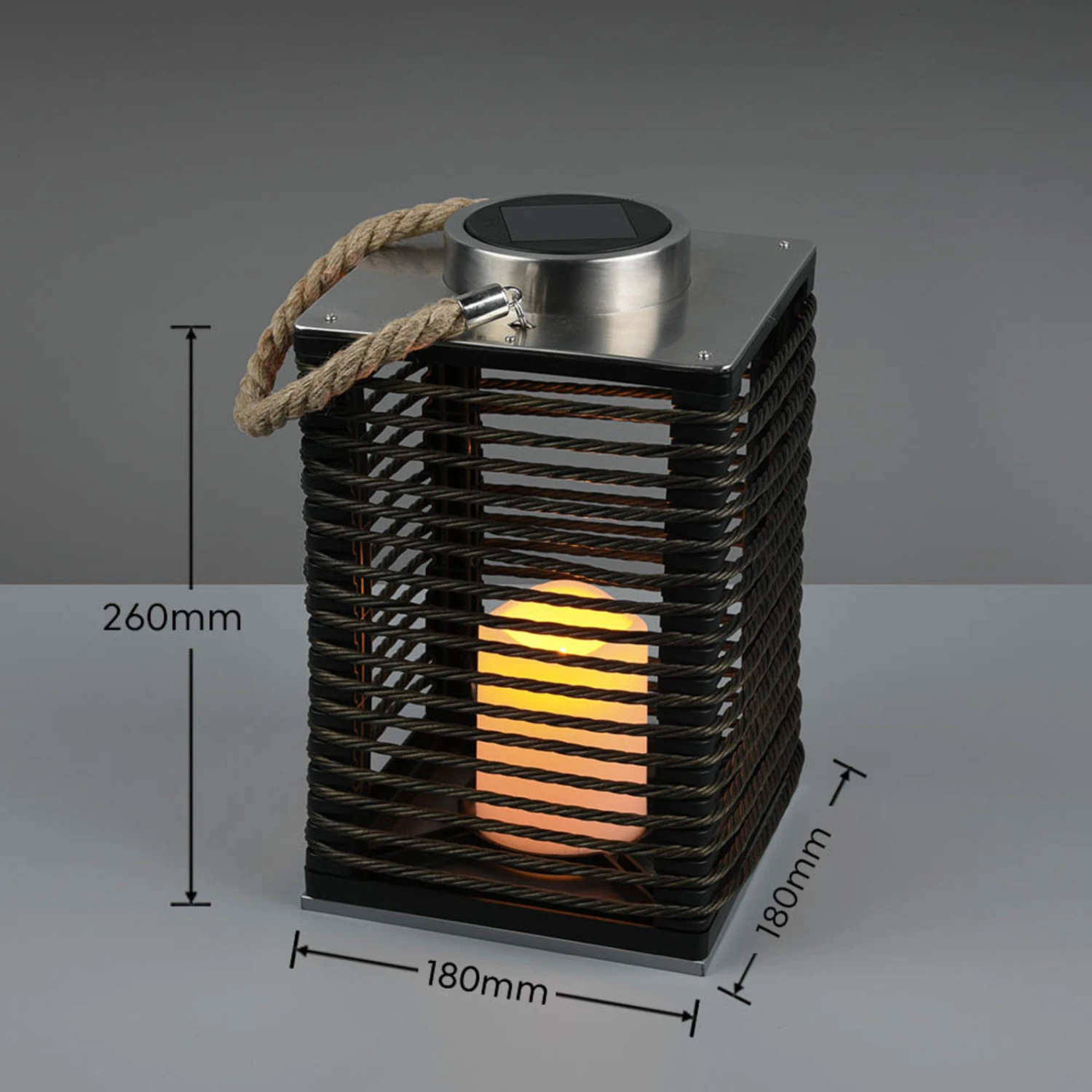 La lampe solaire LED Santana est conçue comme un photophore portable. À l’intérieur de la cage parallélépipédique en plastique noir se trouve une bougie décorative avec LED intégrée qui produit un effet de flammes très suggestif. Le panneau solaire intégré sur le dessus alimente la batterie de la lampe, ce qui évite un raccordement électrique externe. Santana dispose d’un interrupteur pour la commande manuelle et d’un capteur de lumière du jour qui active automatiquement la lampe dans l’obscurité. Le câble brun naturel invite à changer constamment l’emplacement de la lampe décorative et permet également de la suspendre.