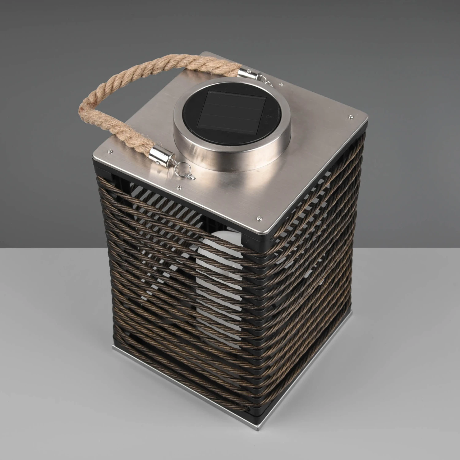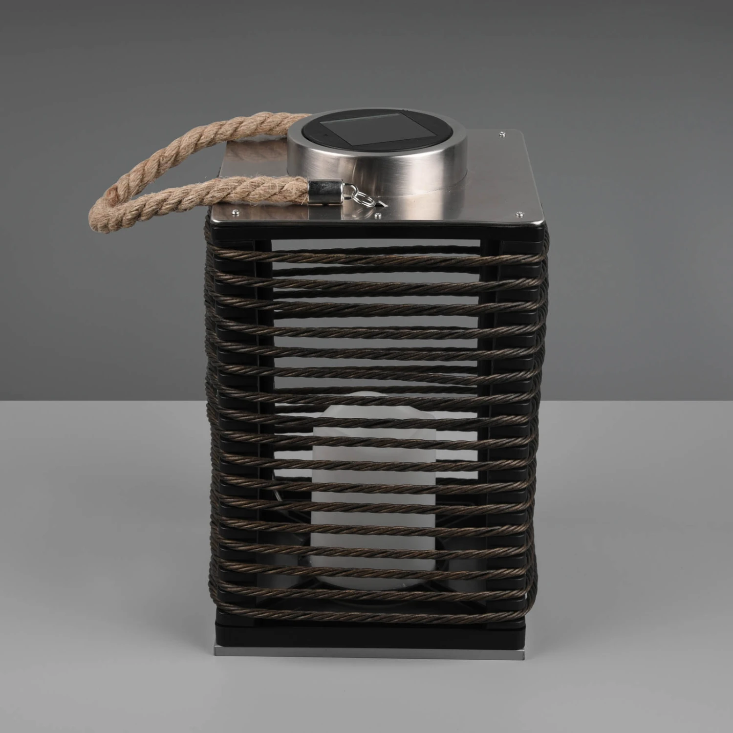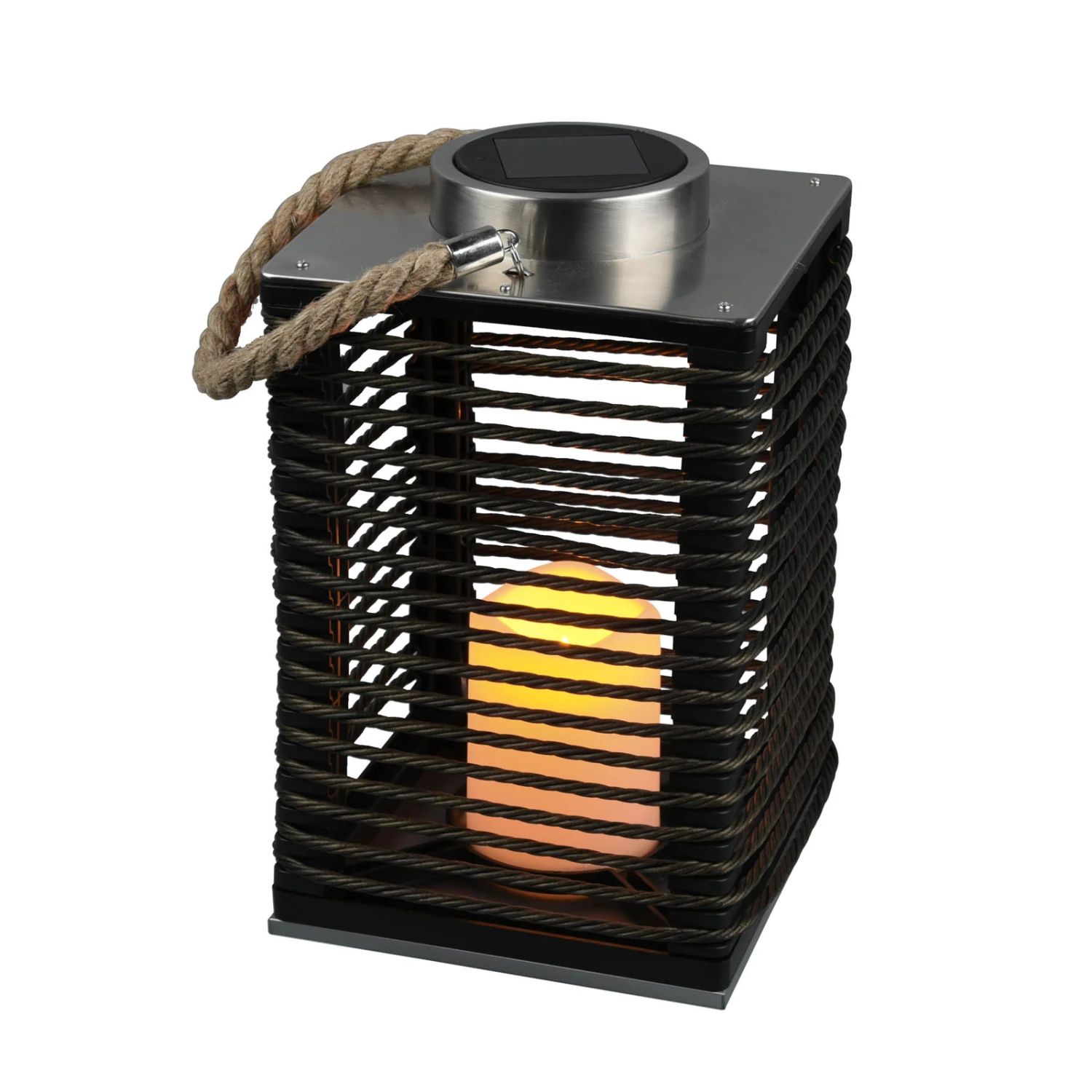 La lampe solaire LED Santana est conçue comme un photophore portable. À l’intérieur de la cage parallélépipédique en plastique noir se trouve une bougie décorative avec LED intégrée qui produit un effet de flammes très suggestif. Le panneau solaire intégré sur le dessus alimente la batterie de la lampe, ce qui évite un raccordement électrique externe. Santana dispose d’un interrupteur pour la commande manuelle et d’un capteur de lumière du jour qui active automatiquement la lampe dans l’obscurité. Le câble brun naturel invite à changer constamment l’emplacement de la lampe décorative et permet également de la suspendre.