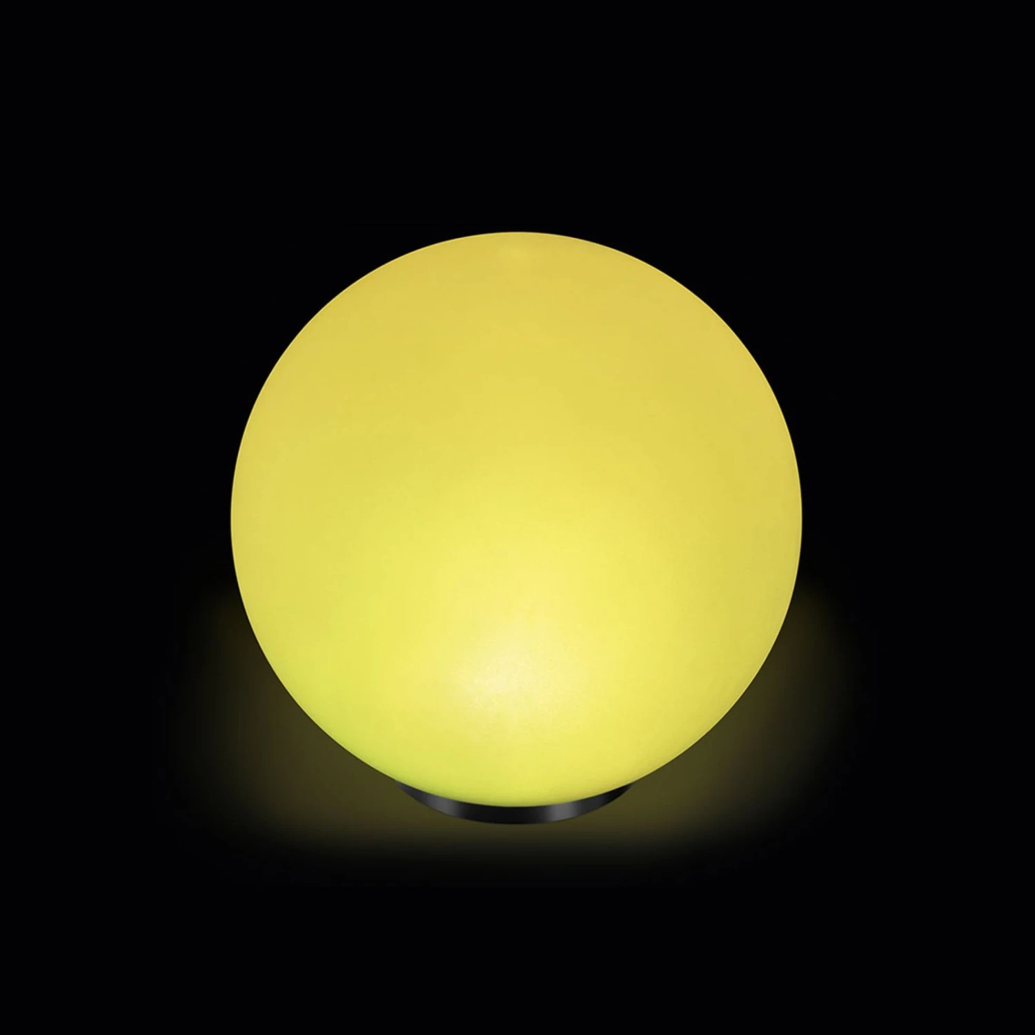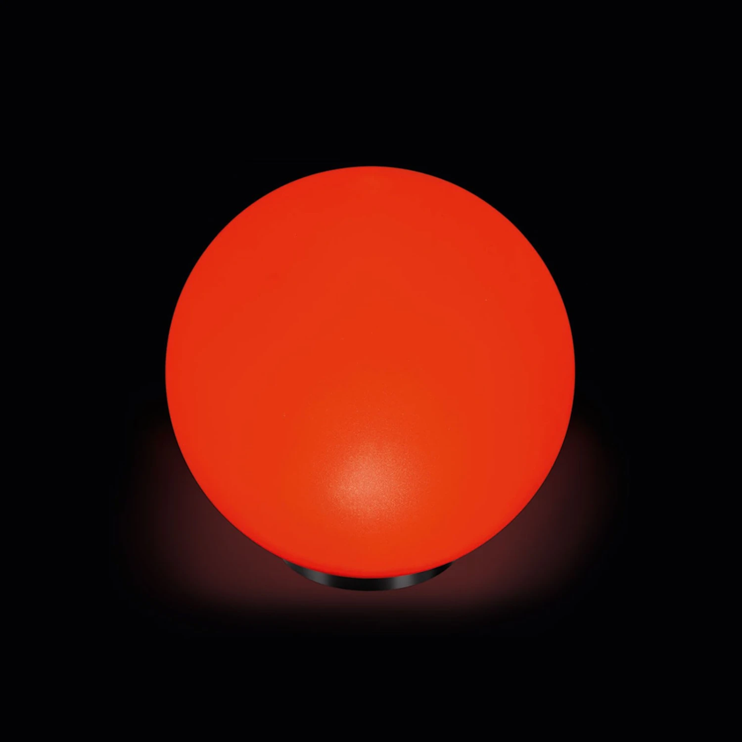 Boule solaire LED décorative – crée des effets lumineux fascinants à l’extérieur, Ø 20 cmCette lampe solaire LED permet de créer des accents lumineux décoratifs et d’ambiance dans le jardin ou sur la terrasse, car la boule se charge en électricité pendant la journée à l’aide de l’énergie solaire et est équipée de LED RVB ainsi que d’une fonction de changement de couleur intégrée, de sorte qu’elle rayonne dans différentes couleurs de lumière. Qu’elle soit utilisée seule ou en combinaison avec d’autres boules solaires, cette lampe apporte une touche décorative à tout espace extérieur, de jour comme de soir ou de nuit. Elle est fabriquée en plastique mat qui ressemble à s’y méprendre à du verre sablé et est équipée à l’intérieur d’un module solaire cristallin.Outre un changement de couleur en douceur (une couleur différente chaque minute), il est également possible de régler des couleurs de lumière individuelles (jaune, rouge, vert, cyan, bleu foncé, violet ou lumière du jour), ce qui permet de créer à tout moment l’ambiance adéquate.- Sphère Ø 20 cm : batterie Mignon (AA) NiMh 1,2 V/900 mAh incluse