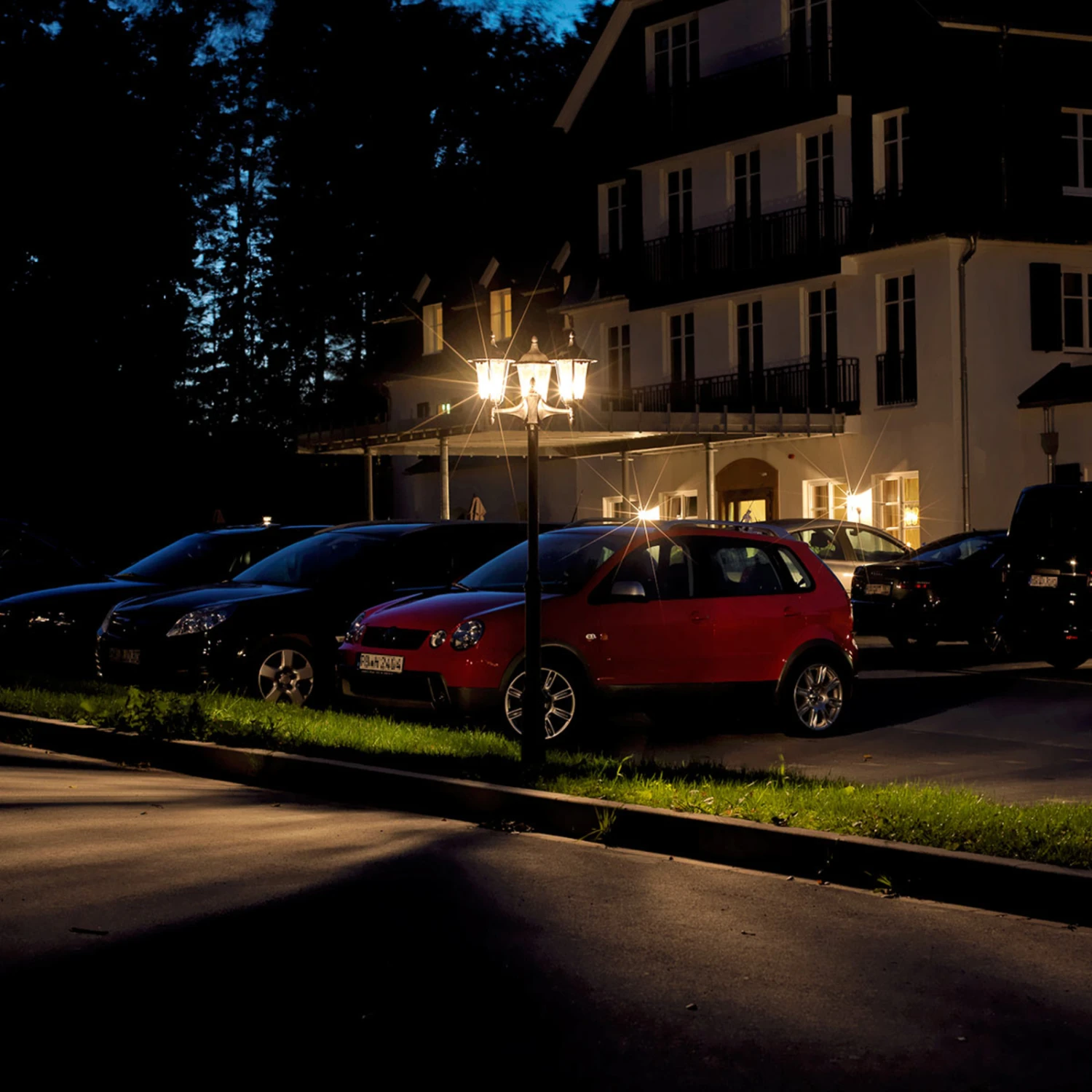 Le lampadaire d’extérieur 2099 à trois lampes est un produit de qualité allemand, fabriqué en Allemagne à partir de matériaux sélectionnés. Les trois abat-jour affichent un design de lanterne classique et sont fabriqués en aluminium coulé et en verre cathédrale. Le verre transparent permet de diffuser la lumière de tous les côtés sans obstacles, garantissant ainsi le meilleur éclairage d’extérieur possible.