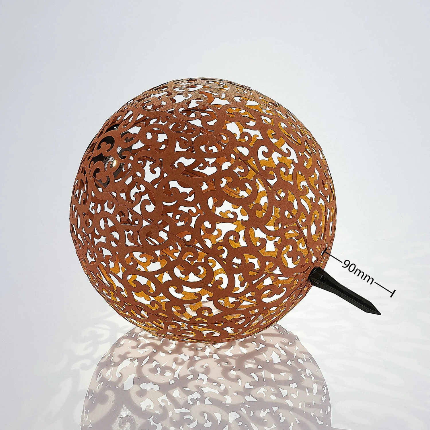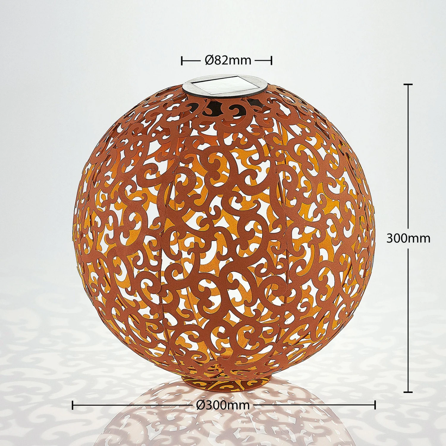 Lampe solaire LED Eduta sphérique couleur rouille au motif de vrilles romantiques