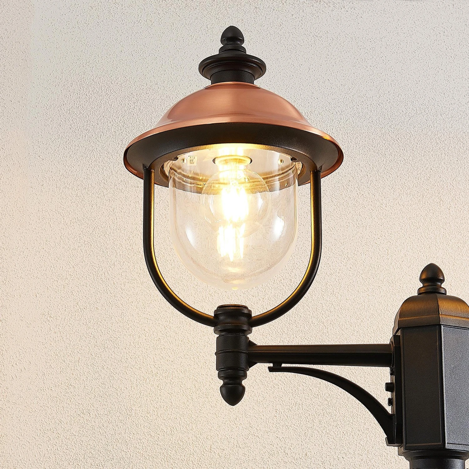 Le grand lampadaire d’extérieur Clint aux deux sources lumineuses offre un bon éclairage d’orientation pour l’extérieur. Sur les places de parking, les voies d’accès ou encore dans un jardin, Clint éclaire les environs de manière sûre et fiable. Les deux sources lumineuses sont placées sur le support en aluminium tout noir et ressemblent à des lanternes nostalgiques. Outre les petites décorations sur le support lui-même, les abat-jour arborent un détail aussi élégant que fonctionnel. L’extrémité en cuivre ressemble à un chapeau ou à un toit et fait à la fois office d’élément contrasté et de couvercle protecteur. Grâce à ces matériaux, Clint convient également pour une utilisation près de la mer.
