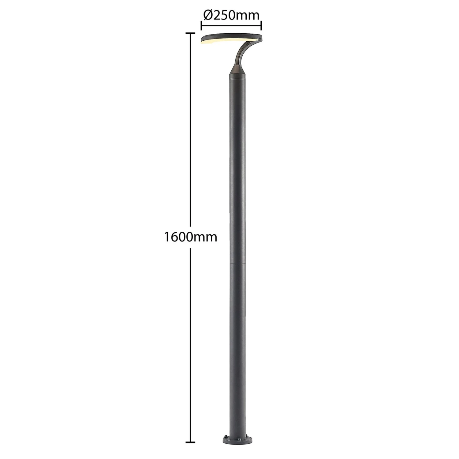 Le mât d’éclairage LED Keily séduit par son design haut perché et ses couleurs sobres. Il se compose d’une fine entretoise qui se transforme en un demi-cercle à son sommet. Ce demi-cercle sert en quelque sorte d’abat-jour et est équipé de LED fixes. Celles-ci génèrent un éclairage blanc chaud qui convient parfaitement pour une terrasse ou une allée. L’indice de protection IP54 protège le luminaire LED sur mât Keily contre la poussière et les projections d’eau, ce qui en fait un produit idéal pour l’extérieur. En combinant Keily avec d’autres luminaires de sa série, ils peuvent accompagner ensemble un chemin à l’extérieur et y apporter la lumière nécessaire dans l’obscurité.
