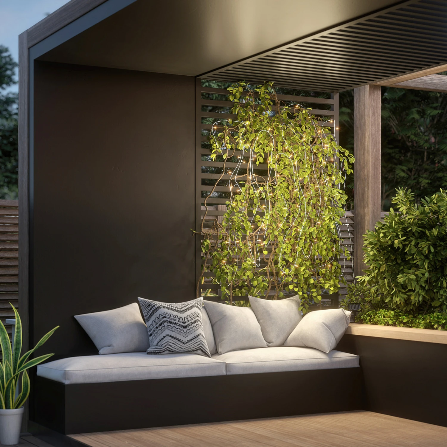 Guirlande lumineuse solaire à LED Styrmir en plastique avec panneau solaireStyrmir convient parfaitement pour illuminer différents objets dans le jardin. La guirlande lumineuse mesure 20 mètres de long et est alimentée par un panneau solaire, de sorte qu’aucun branchement électrique n’est nécessaire. Avec une batterie pleine, la lampe solaire fournit jusqu’à huit heures de luminosité et donne par exemple un aspect particulier à un arbre. Le type de protection IP44 rend la guirlande lumineuse solaire à LED Stymir parfaite pour l’extérieur, car elle est protégée contre les projections d’eau. Elle permet de compléter avec bienveillance le reste de la décoration du jardin et de créer une ambiance attrayante dans le jardin.