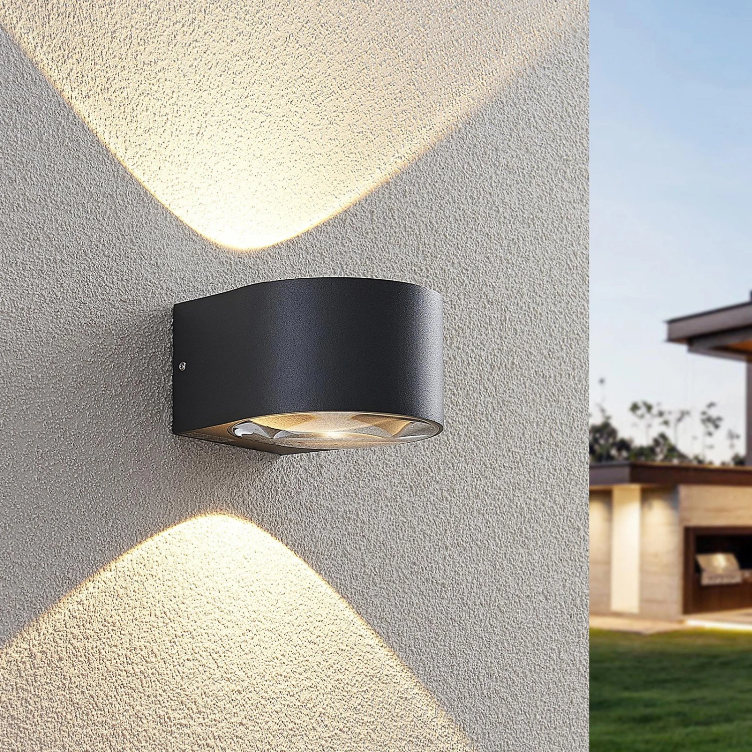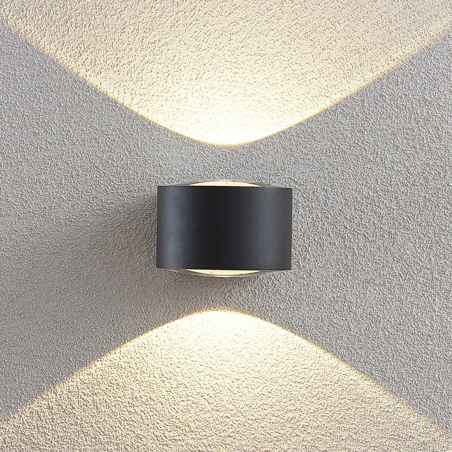 La lampe Astrida est composée d’un corps cylindrique en aluminium moulé sous pression. Une lentille en verre est placée respectivement en haut et en bas, ce qui assure un éclairage particulièrement beau et clairement délimité. Cet effet lumineux est déjà visible de loin et fait de la façade d’une maison un objet élégant, même la nuit. Les environnements modernes profitent particulièrement du look original de cette applique conçue pour l’extérieur. La lampe Astrida bénéficie ainsi d’une bonne résistance aux chocs (IK06) et grâce à la possibilité de câblage traversant, elle peut être installée facilement en plusieurs exemplaires.