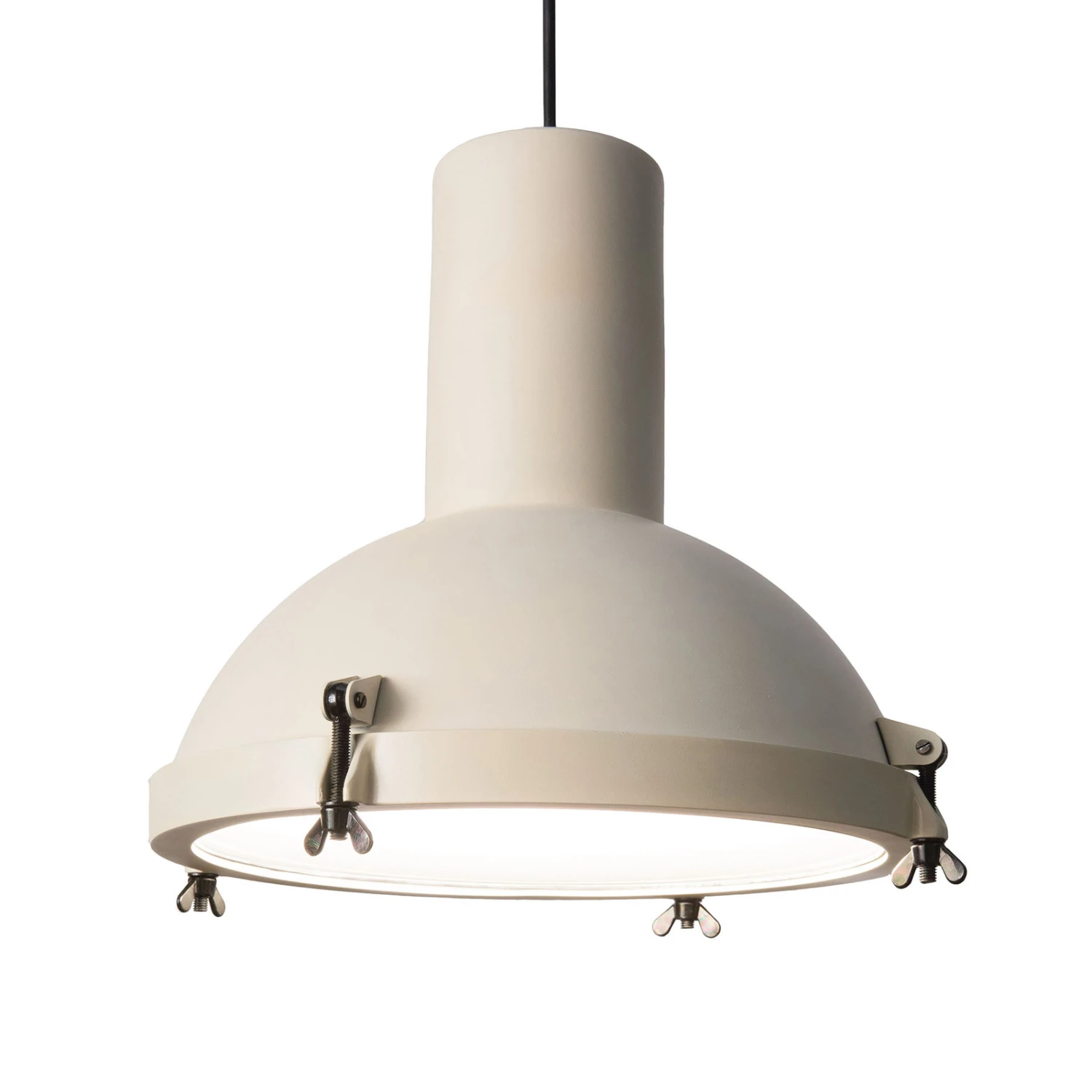 Que ce soit dans un jardin d’hiver ou dans une station thermale, ce luminaire suspendu est une source de lumière directe polyvalente qui peut être combinée de nombreuses façons et qui s’inscrit parfaitement dans la tendance avec ses détails industriels. Les quatre vis à oreilles noires remplissent une fonction non seulement visuelle mais aussi fonctionnelle : elles servent à fixer le disque diffuseur. Il s’agit d’un verre incurvé, sablé à l’intérieur, qui assure une émission de lumière uniforme. La structure de l’abat-jour est en aluminium, de forme hémisphérique simple avec un prolongement cylindrique.