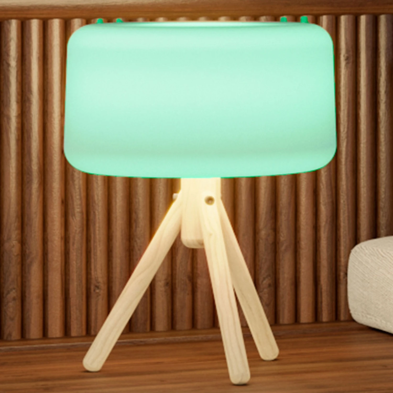 Lampe de table LED Chloe avec base en bois tripode, batterie rechargeable et panneau solaire