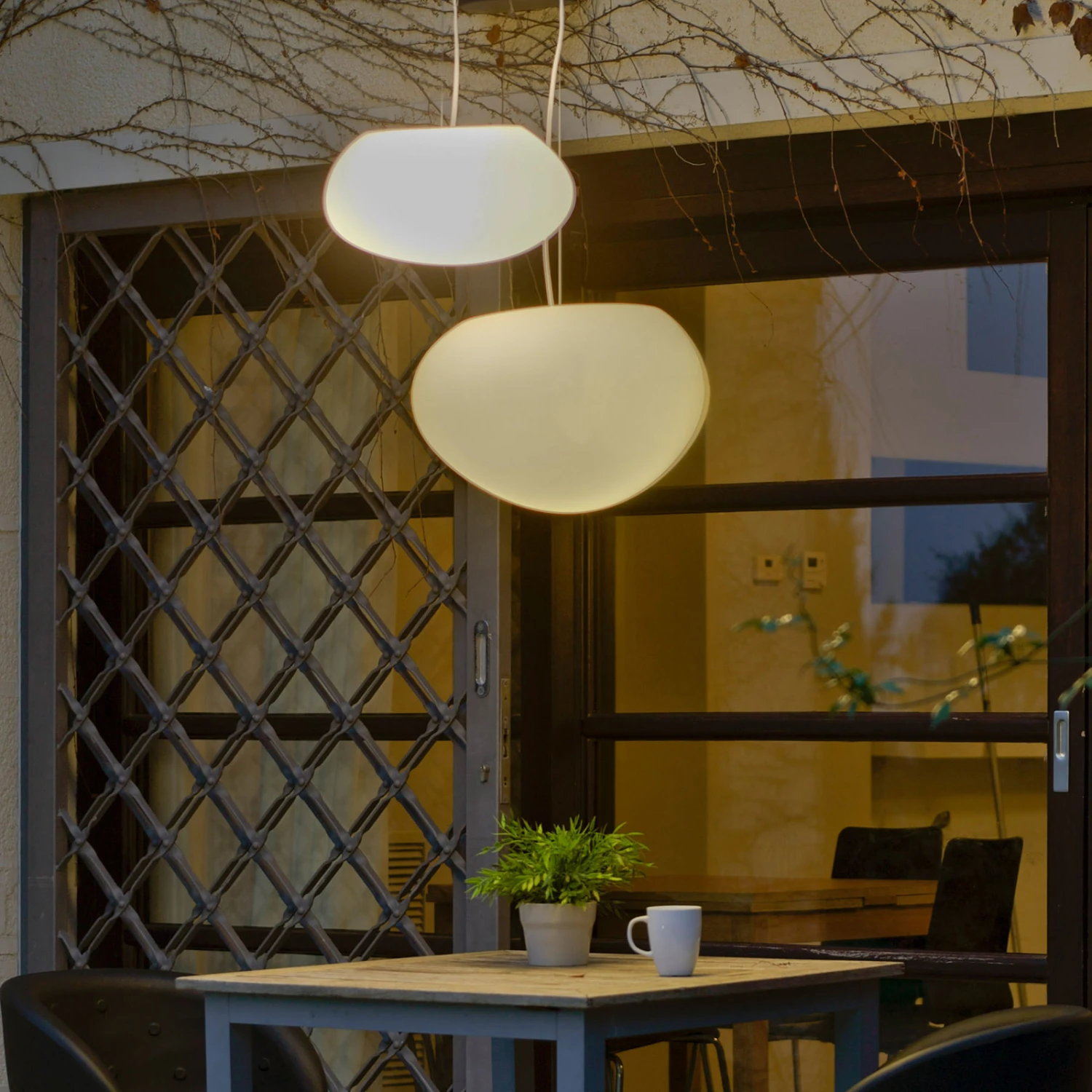 La lampe suspendue Petra a Ă©tĂ© conçue pour une utilisation en extĂ©rieur. La lampe Ă©claire les tables de terrasse ou les tables d’objets gastronomiques sans Ă©blouissement et de maniĂšre homogĂšne et constitue Ă©galement une excellente dĂ©coration. L’abat-jour de la lampe est fabriquĂ© en polyĂ©thylĂšne translucide, un plastique recyclable et rĂ©sistant aux UV, qui rĂ©siste Ă©galement aux tempĂ©ratures extrĂȘmes.