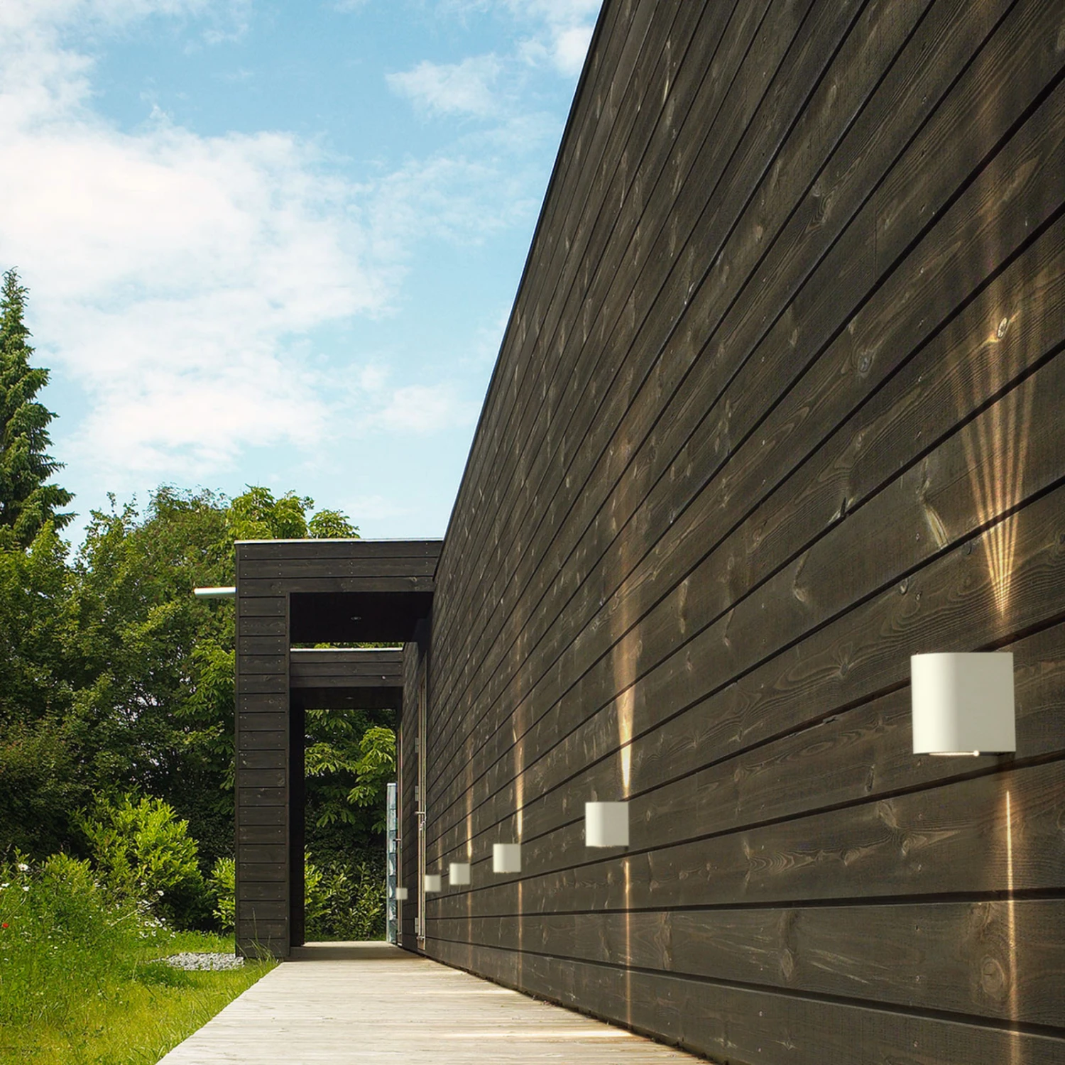 Le luminaire mural extérieur Canto 2 LED a la forme d’un parallélépipède, arrondi à l’avant, qui correspond ici à un cylindre. Le corps, en aluminium moulé par injection, présente des ouvertures rondes en haut et en bas, qui sont recouvertes de couvercles en verre transparent. Les LED situées derrière lui émettent une lumière blanche chaude avec un angle de faisceau de 120°, qui éclaire l’extérieur sous forme d’éclairage de haut en bas. Les modèles inclus dans le volume de livraison offrent également la possibilité de créer des accents décoratifs sur le mur en utilisant des motifs lumineux spécialement conçus.