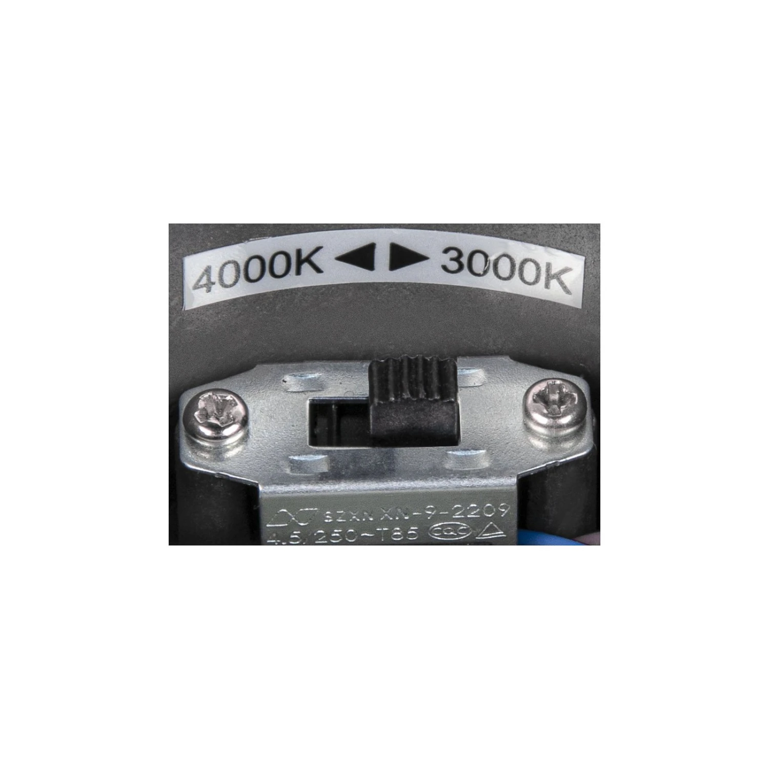 Cette série Ovalisk pour l’extérieur est synonyme de design moderne et élégant. Le plafonnier est conçu dans une forme cylindrique de base ; la source de lumière LED se trouve dans un diffuseur mat qui émet la lumière uniformément tout autour. Celui-ci est entouré d’un abat-jour ovale arrondi en verre transparent gris fumé, qui est monté sous un support de plafond noir anthracite en aluminium. Le point fort du plafonnier LED Ovalisk est la couleur de la lumière réglable, qui peut être ajustée au blanc chaud (3 000 K) ou au blanc universel (4 000 K) à l’aide d’un petit curseur dans le boîtier avant l’installation.