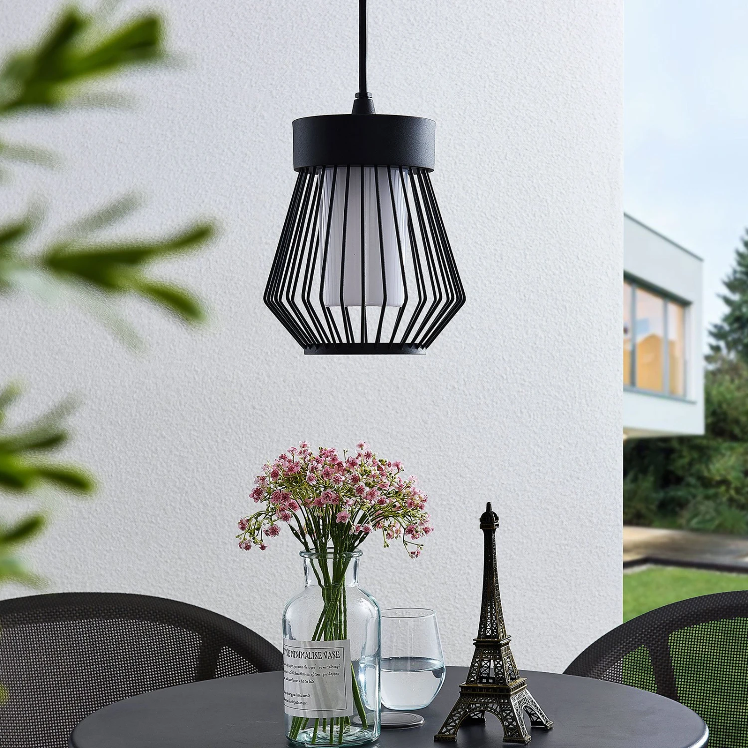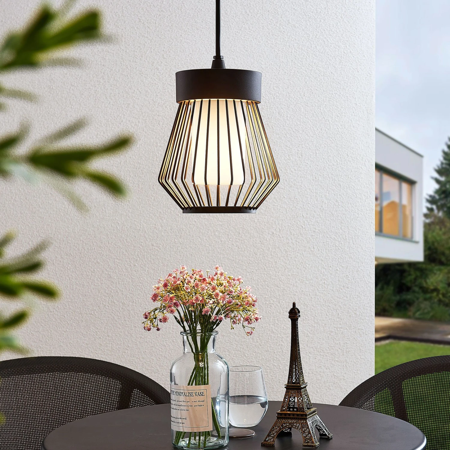Vajana peut être utilisé en extérieur comme source lumineuse décorative pour les terrasses et les balcons couverts. La suspension fonctionne avec une ampoule E27 au choix et allie un abat-jour cage avec un élément abat-jour en polycarbonate, qui distribue la lumière de manière douce et homogène, tout en protégeant l’ampoule.